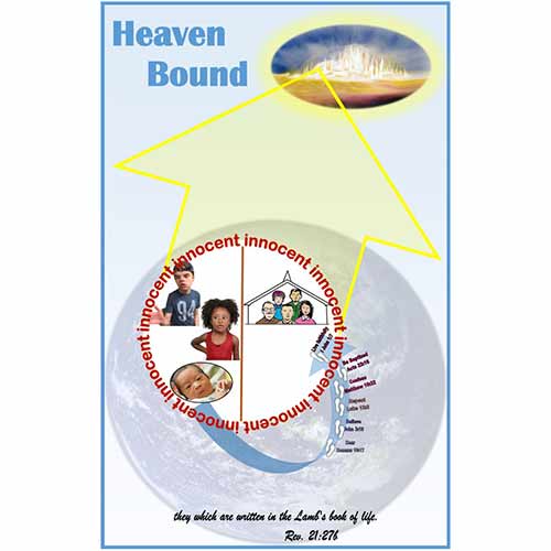 Who is going to heaven? That's one of the most important questions you'll ever talk about with your kids. This poster offers a clear illustration of God's answer. We are all born innocent. Some stay innocent, but for most of us, as we grow, we reach an age (often called the age of accountability) where we can properly reason the difference between right and wrong. At that time, we exit the innocent area. When we choose to follow the steps on the arrow - the steps of salvation - we re-enter the innocent circle. Those in the circle - innocent from birth or new birth - will go to heaven!