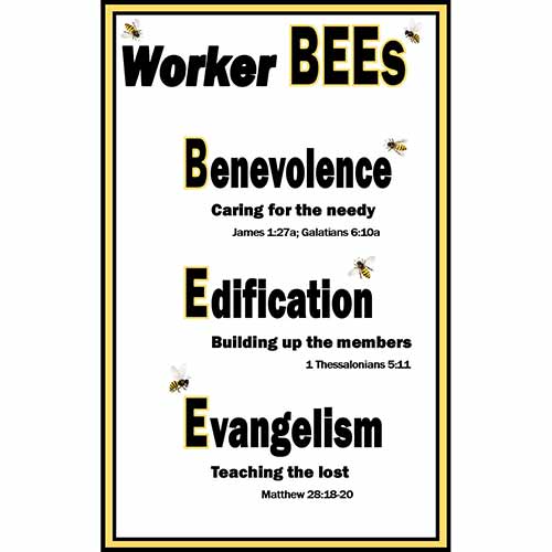 The Lord's people are to be busy as bees working for Him. This simple poster informs us of the three areas we can work in to do His work: benevolence, edification, and evangelism. Each word is defined and Scripture references are provided for instruction and example.
